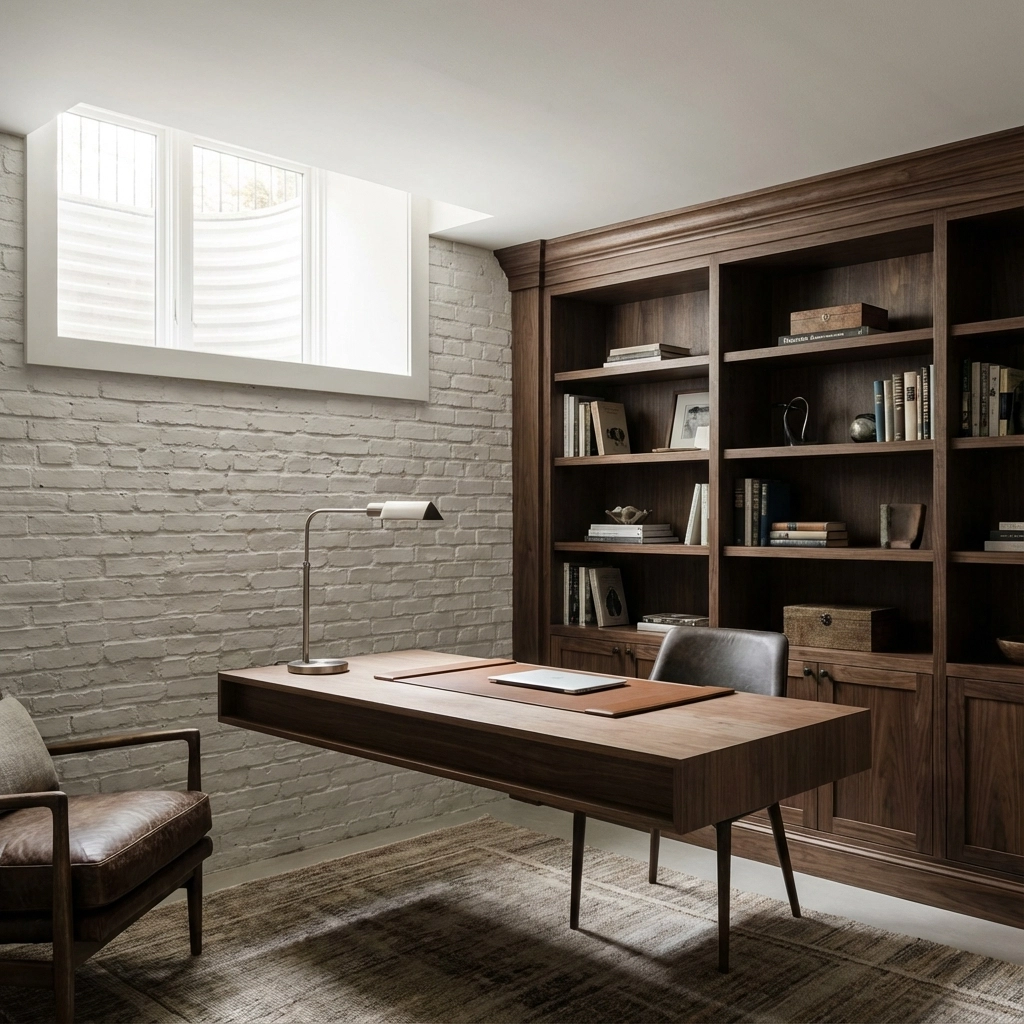 Design your basement home office around heritage elements that inspire productivity. Install traditional wainscoting or board-and-batten paneling at desk height to add architectural interest while protecting walls from chair damage. Choose deep, rich paint colors like heritage navy or forest green for accent walls behind your workspace.