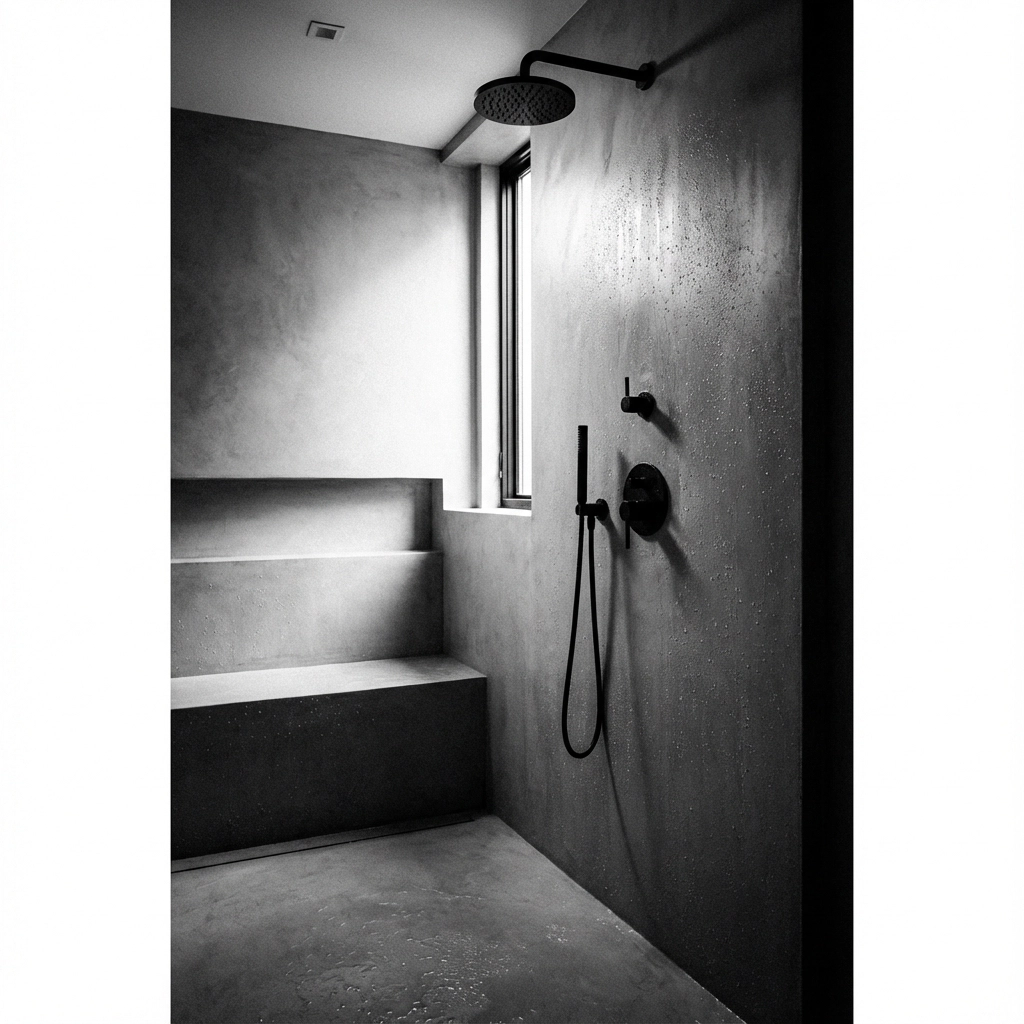Microcement's thin application allows installation over existing tile without raising floor levels or requiring fixture adjustments: perfect for basement renovations with limited ceiling height.