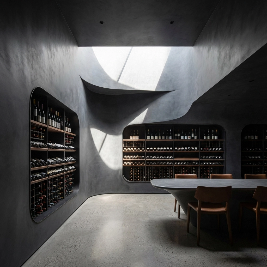 Highlight curved walls, built-in niches, and custom millwork with surfaces that follow complex shapes without visible joints. Picture basement wine cellars, reading nooks, or office built-ins where microcement emphasizes architectural details rather than creating distracting grid patterns.
