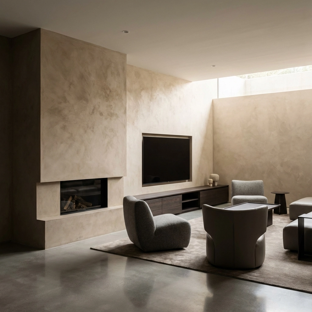 Create dramatic fireplace surrounds that withstand heat while providing seamless visual impact. Experience walls that flow uninterrupted from floor to ceiling, emphasizing architectural features rather than competing with them. Picture entertainment areas where microcement walls provide the perfect backdrop for mounted televisions and built-in cabinetry.